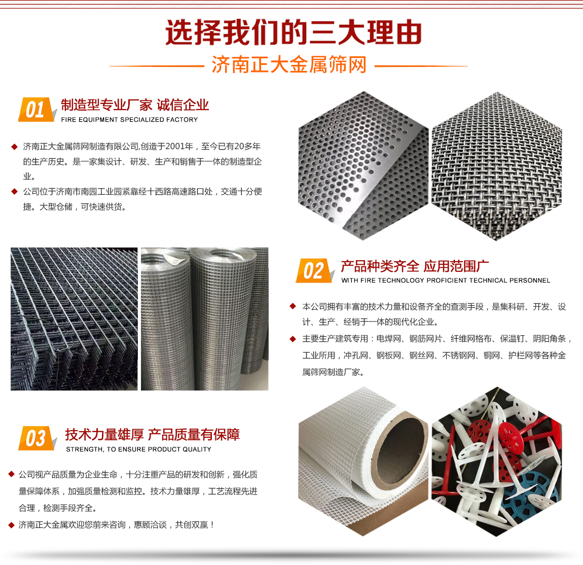 濟南正大金屬篩網(wǎng)制造有限公司,成立于2001年,至今已有20多年的生產(chǎn)歷史,主要生產(chǎn)建筑用:電焊網(wǎng)、鋼筋網(wǎng)片、纖維網(wǎng)格布、保溫釘、陰陽角條,工業(yè)所用,沖孔網(wǎng)、鋼板網(wǎng)、鋼絲網(wǎng)、不銹鋼網(wǎng)、銅網(wǎng)、護欄網(wǎng)等各種金屬篩網(wǎng)制造廠家。 本公司擁有豐富的技術力量和設備齊全的查測手段,是集科研、開發(fā)、設計、生產(chǎn)、經(jīng)銷于一體的現(xiàn)代化企業(yè)。公司位于濟南市南園工業(yè)園緊靠經(jīng)十西路高速路口處,交通十分便捷。